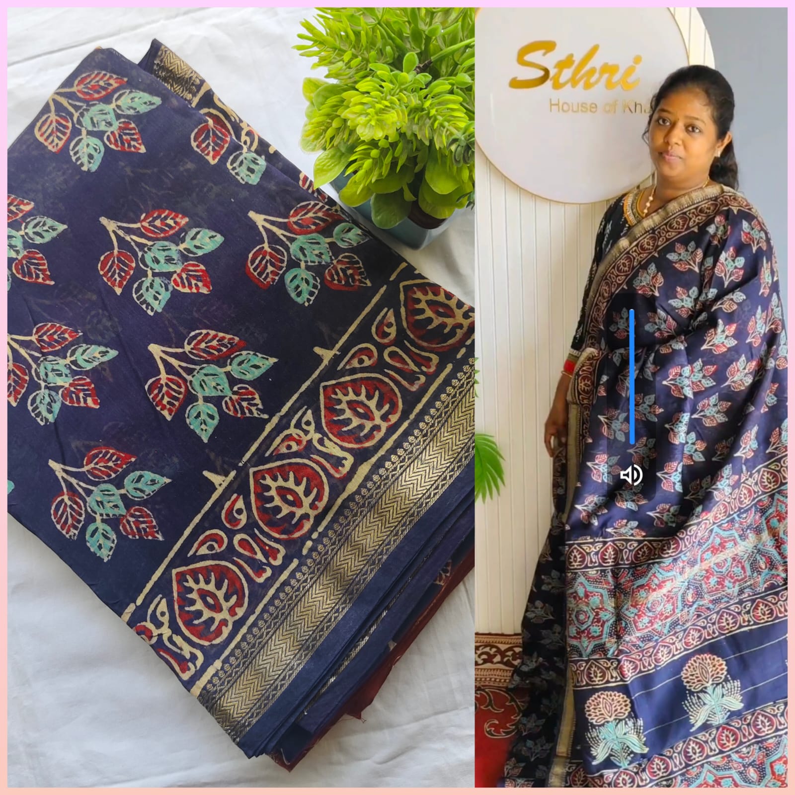 Pure block print Maheshwari silk cotton saree with printed blouse and pallu