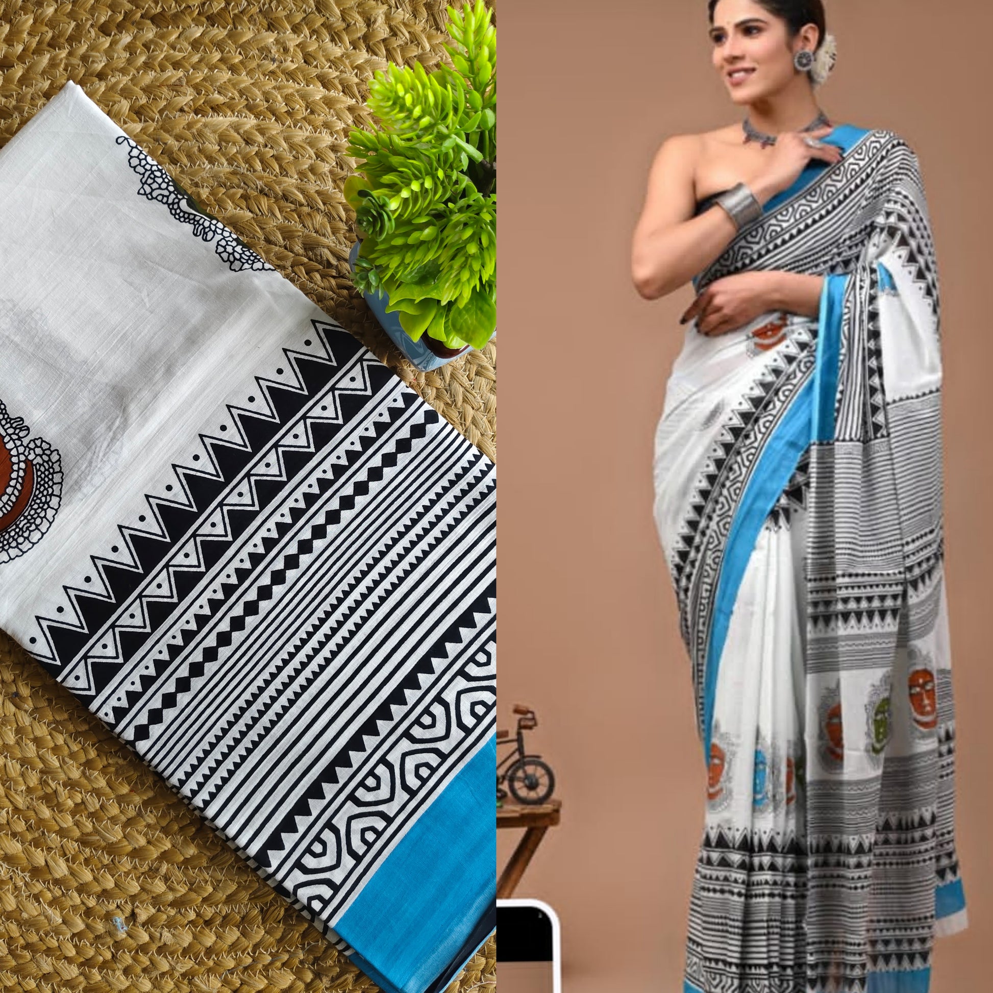 Block print jaipur mul mul cotton saree with printed pallu n blouse