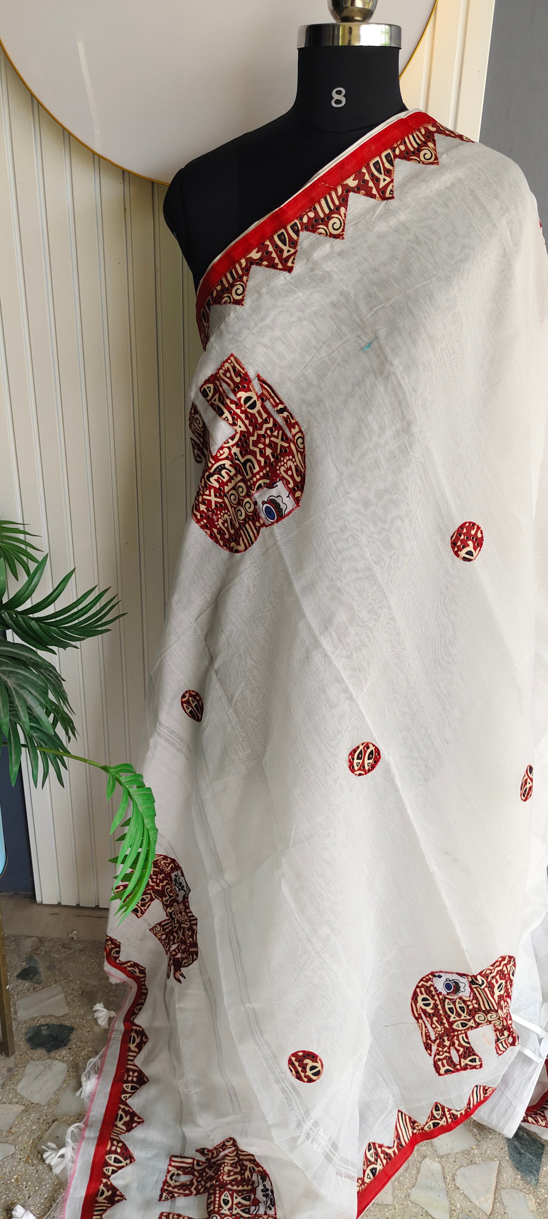 Cotton silk saree with beautiful Ajrak elephant designer patch work all over there saree with running pain blouse and pallu
