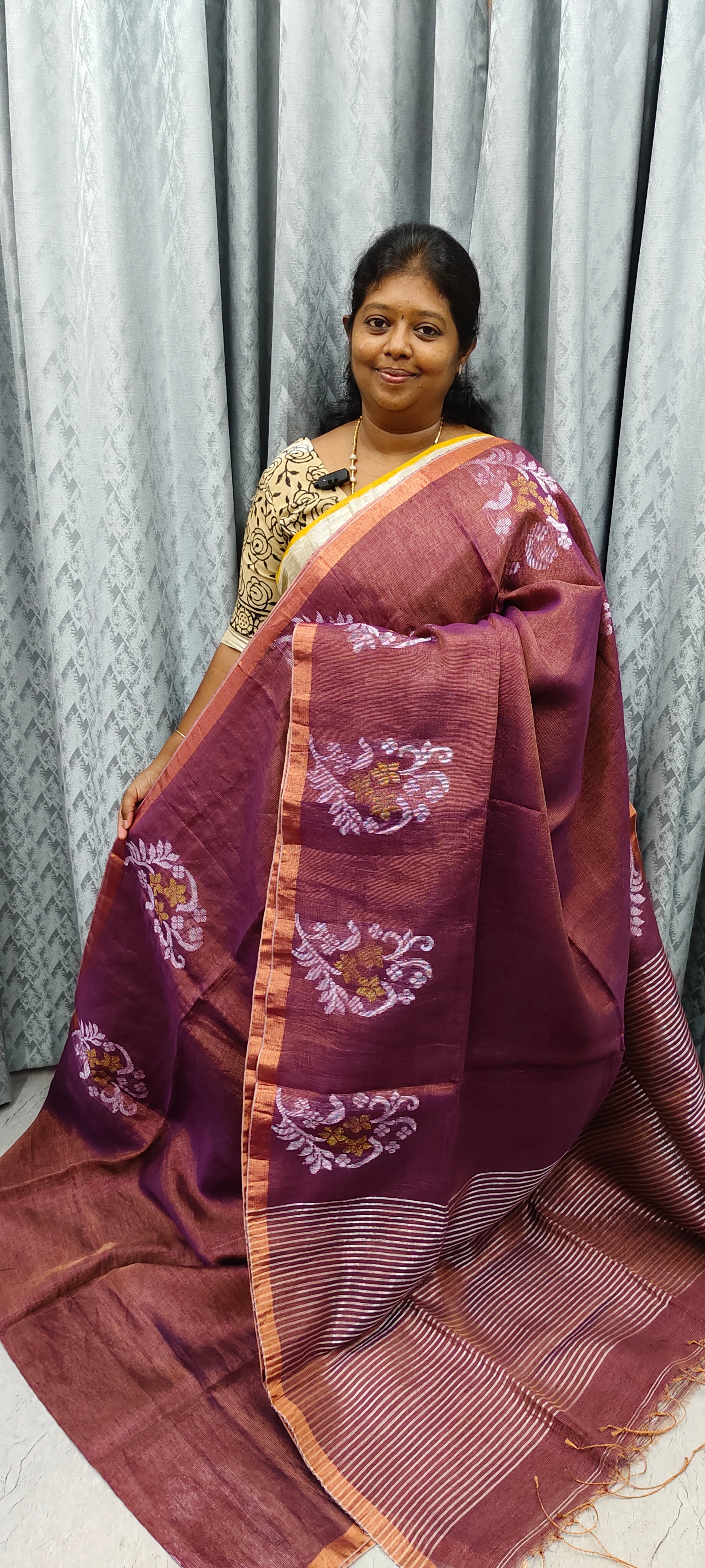Premium organic 120 count linen silk fabric with hand zari weaving motifs with plain blouse
