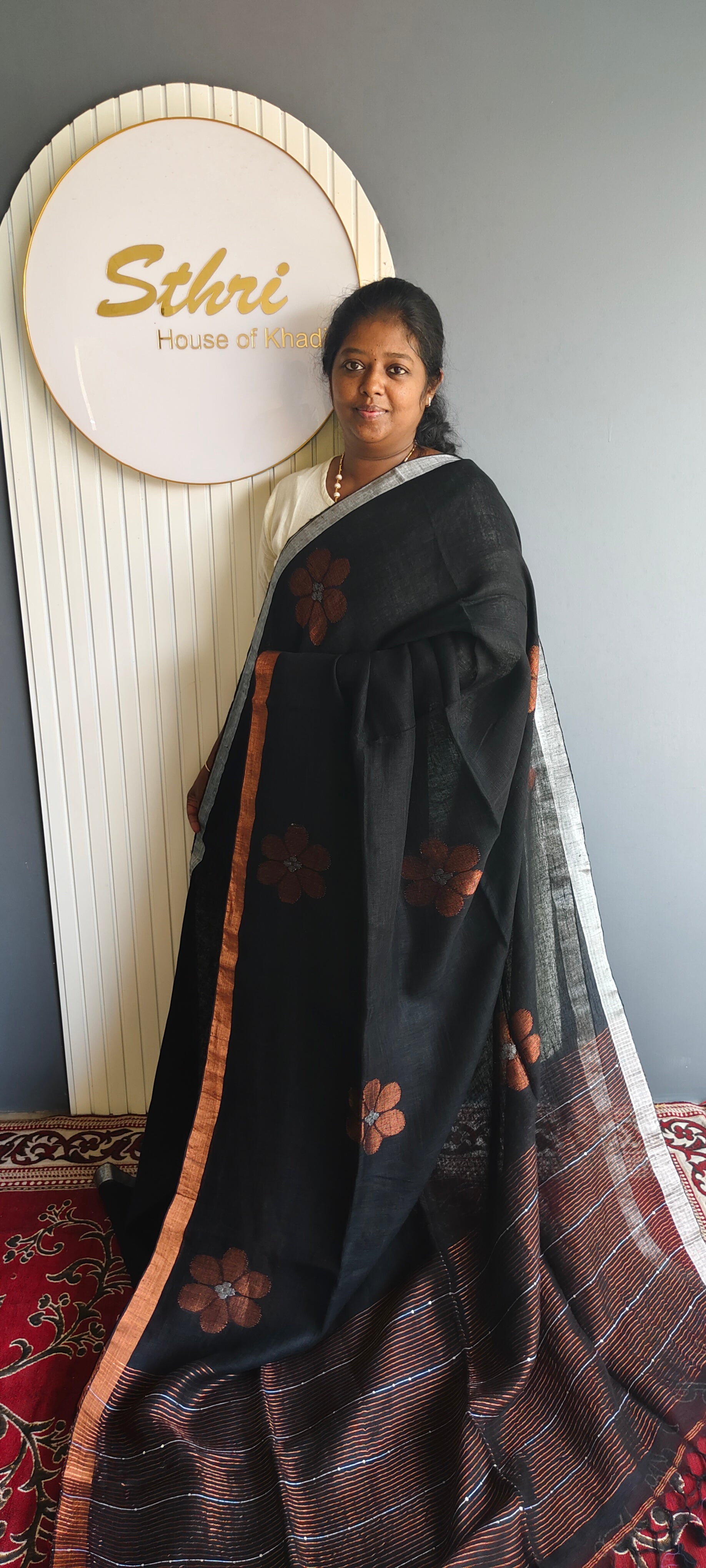 Premium organic 120 count linen silk fabric with hand zari weaving motifs with plain blouse