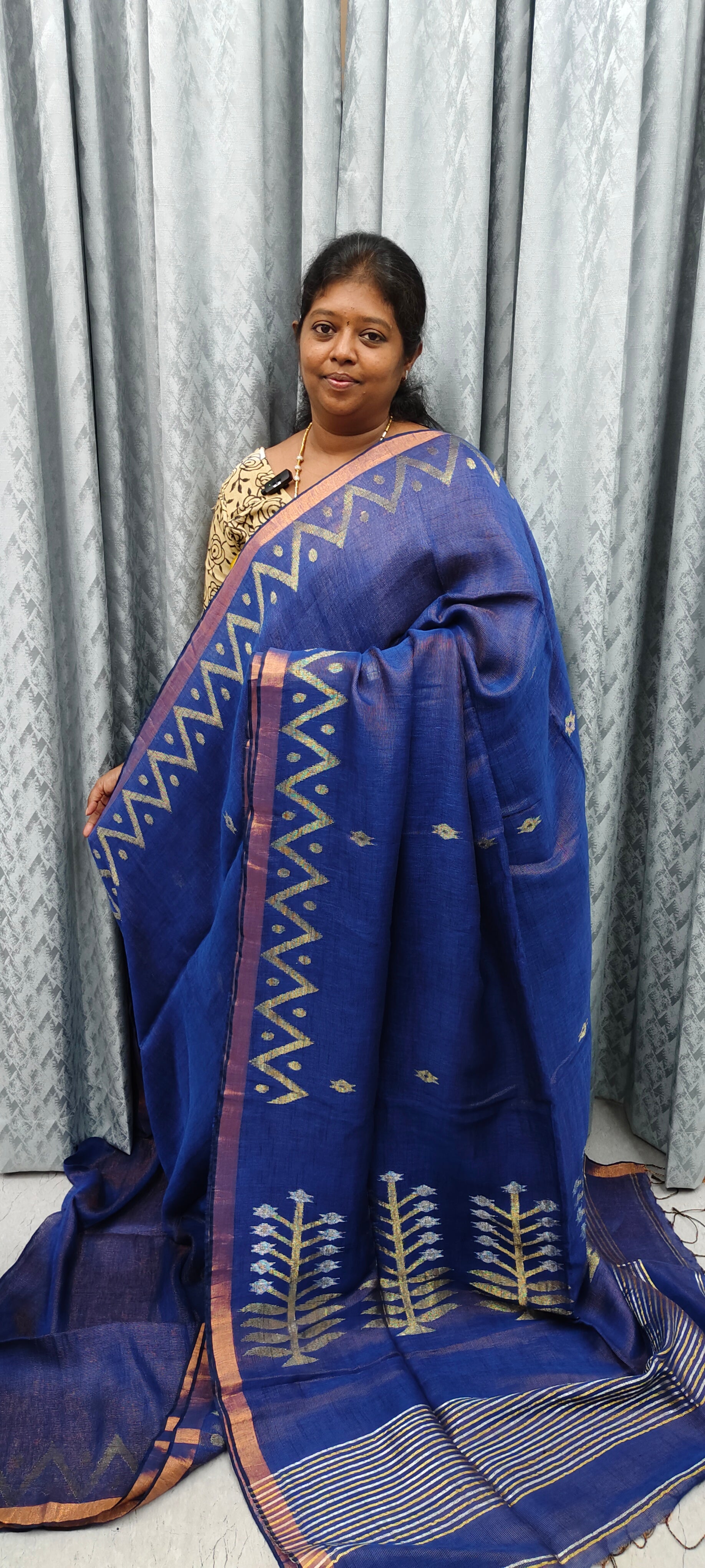 Premium organic 120 count linen silk fabric with hand zari weaving motifs with plain blouse