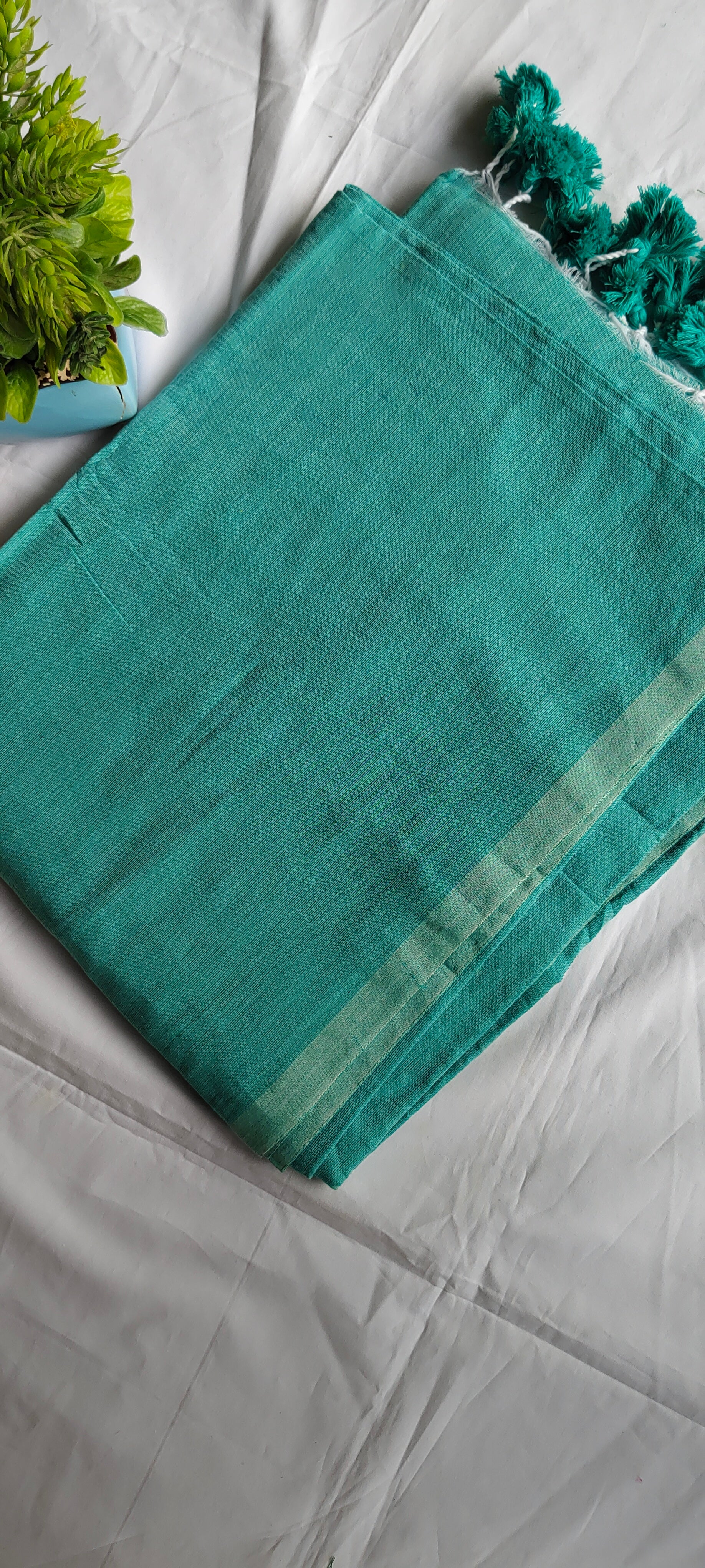 VERY VERY SOFT KHADHI BY MUL COTTON BLENDED SAREE IN BEAUTIFUL DUAL.SHADES WITH CONTRAST BORDER WITH RUNNING BLOUSE N PALLU