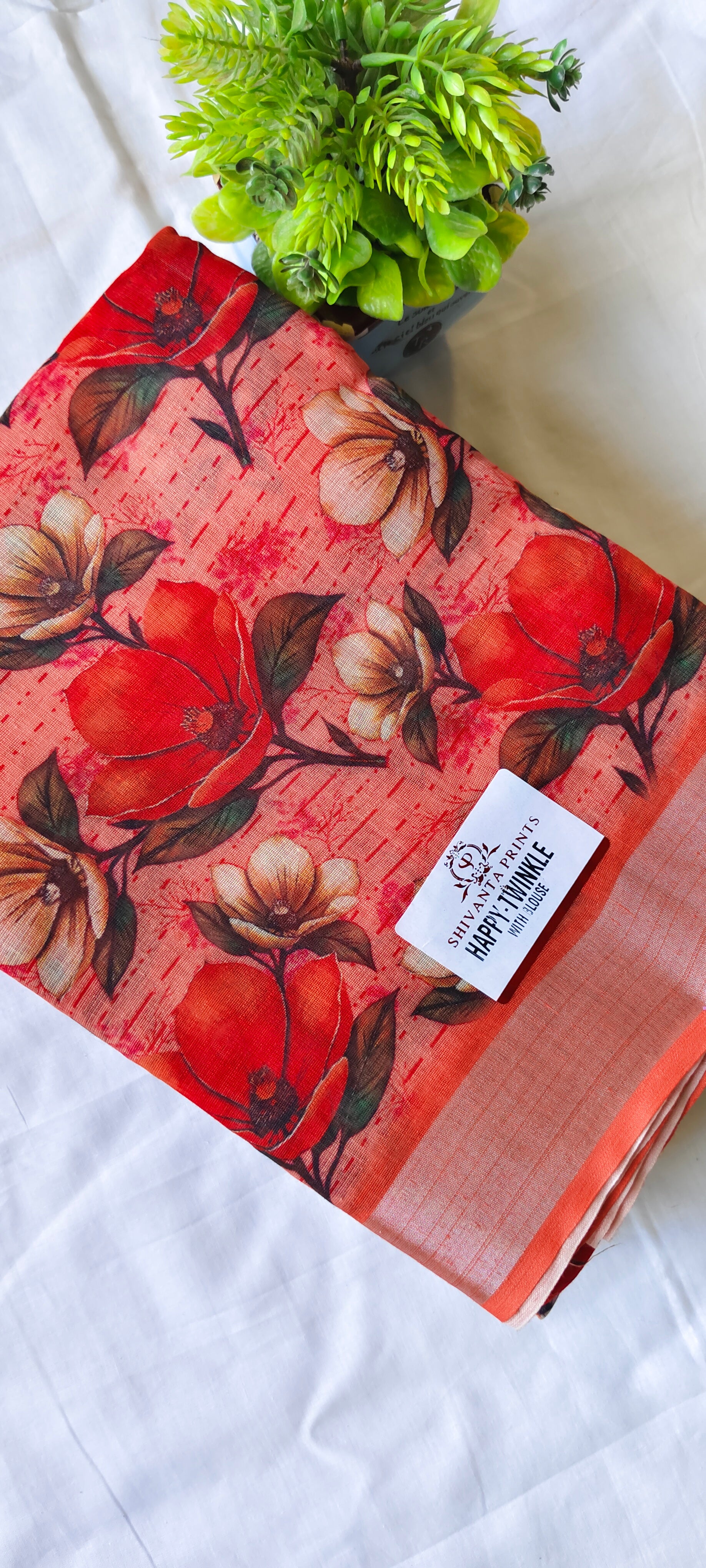 Digital printed linen cotton saree with silver border and printed pallu and blouse