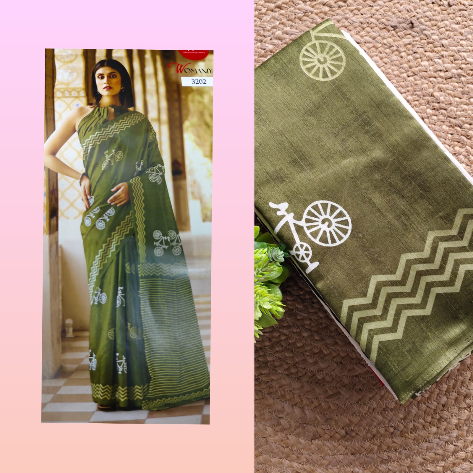 Semi jute silk in trendy block print saree with contrast printed pallu n plain contrast blouse