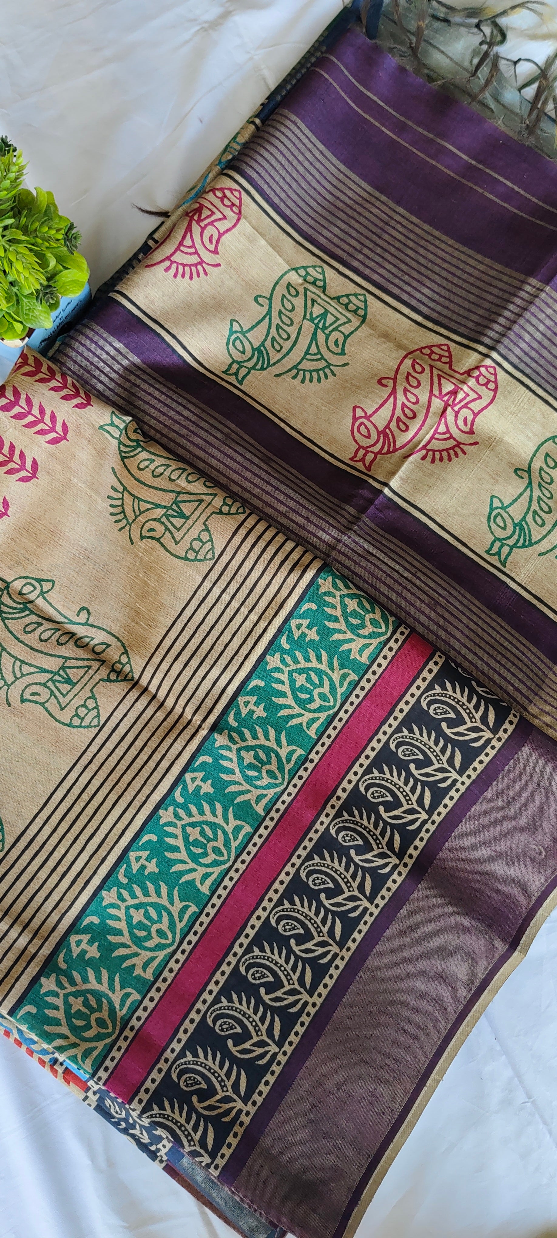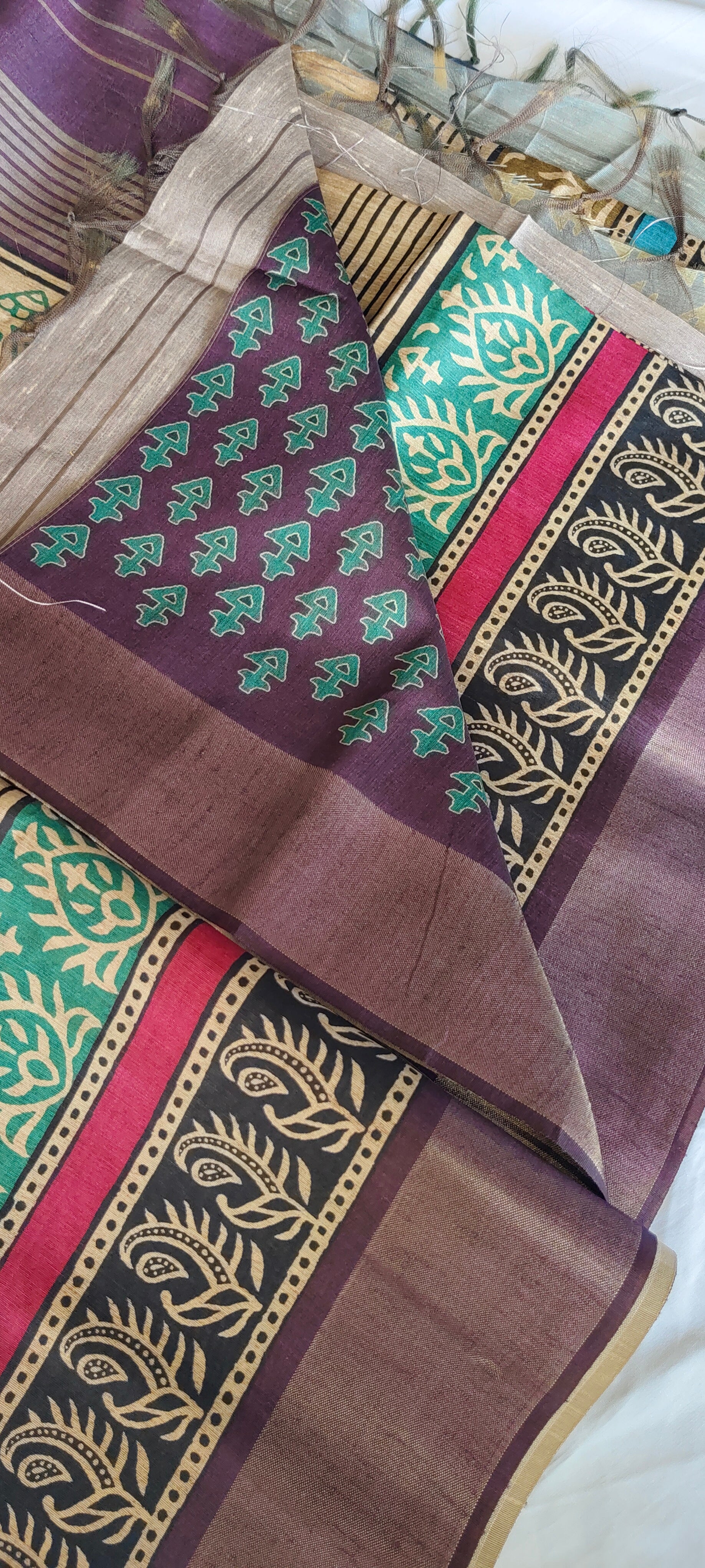 Block printed jute silk with contrast blouse