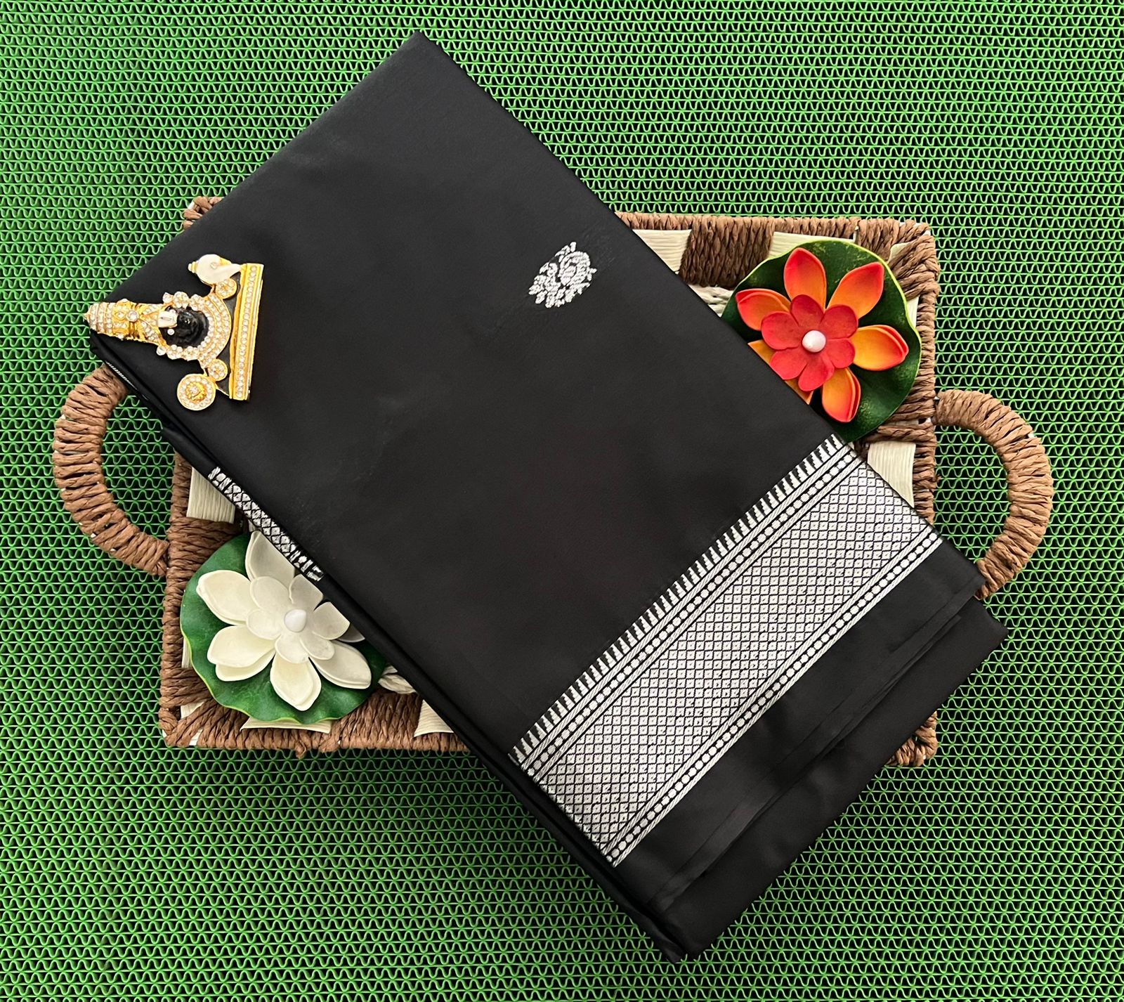Authentic soft Gadwal silk with traditional peacock butta weaving all over the saree with contrast blouse